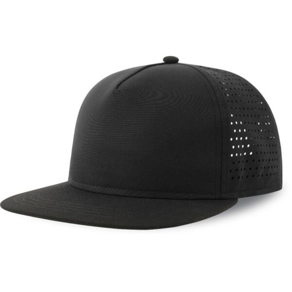 Udržitelný nástupce k modelu Bank (artikl: 33.0133), plochý kšilt se 4 švy, zesílený přední panel, laserované větrací otvory, recyklovaný snap uzávěr, štítek TearAway, ruční praní, nelze žehlit, nelze sušit v sušičce, nelze chemicky čistit