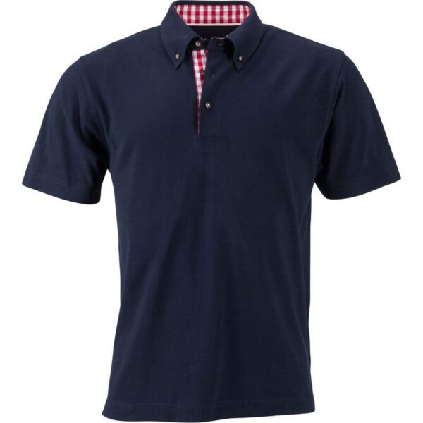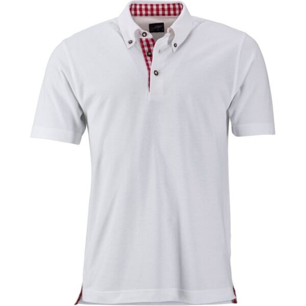 Polo v tradičním vzhledu, button-down límeček, kostkovaná vsadka na límci, vnitřní straně knoflíkové légy a na bočních rozparcích, 3 krojové knoflíky z imitace rohu, půlměsícová podsádka tón v tónu na zádech, pratelné na 40°, nelze sušit v sušičce