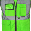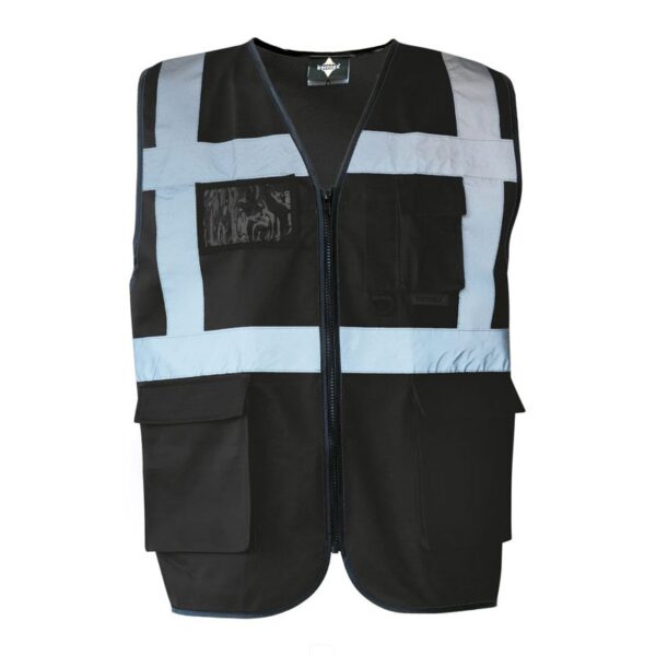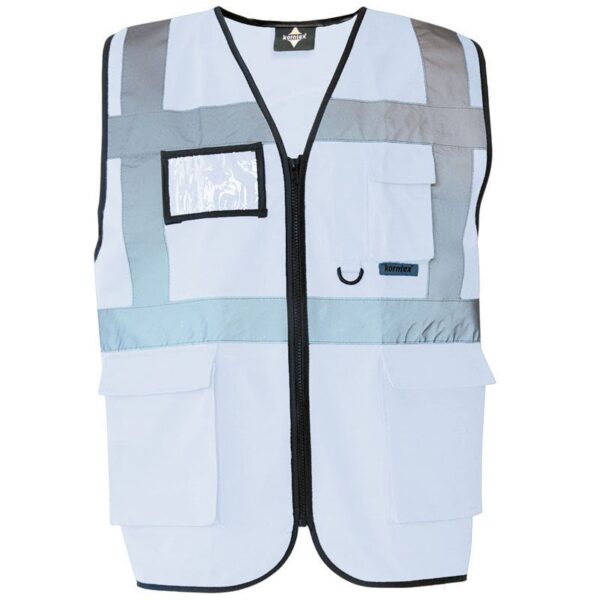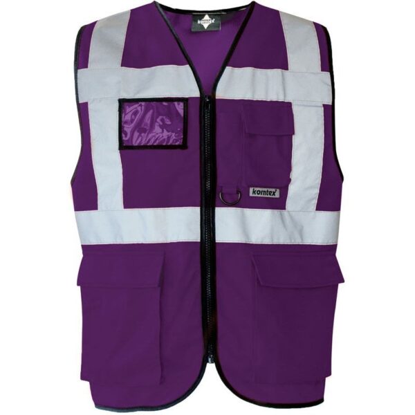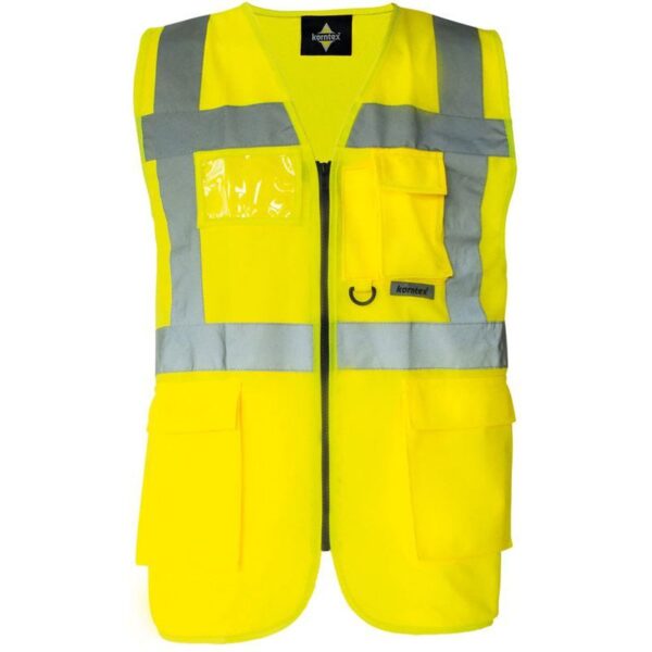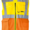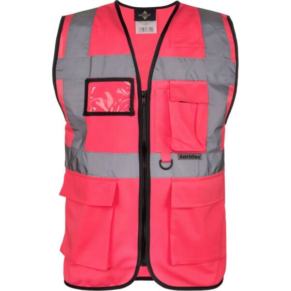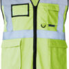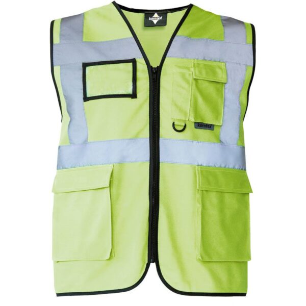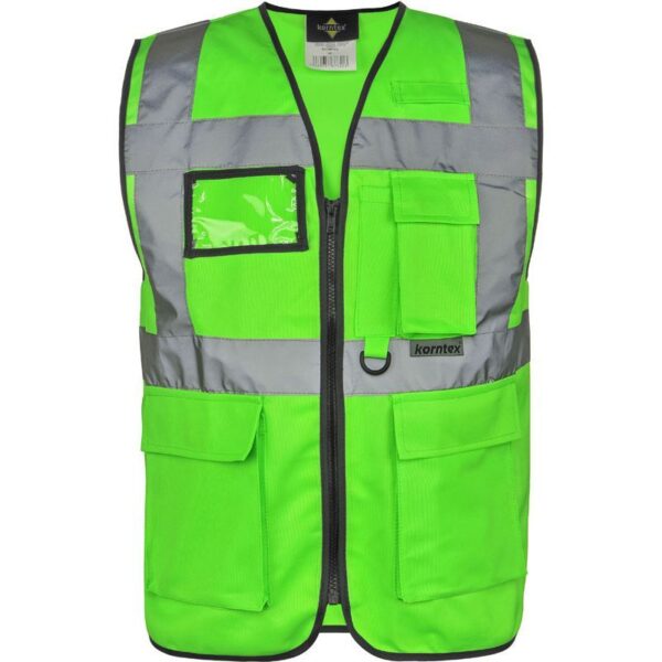 Celopropínací zip přední, 2 kapsy s klopami na suchý zip, kapsa na doklady, kapsa na smartphone, přihrádka na pero, kroužek na klíče, neon pink a neon green certifikace EN 17353 typ AB3 (viditelnost za denního světla a tmy), yellow, orange, yellow/orange und yellow/blue odpovídají normě EN ISO 20471, všechny ostatní barvy odpovídají normě EN 17353 typ B3 (viditelnost za tmy), čtyři reflexní pruhy široké 5 cm
