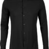 Pánská košile s dlouhým rukávem, italský límec s jedním knoflíkem, zaoblené manžety nastavitelné pomocí 2 knoflíků, 7 knoflíků tón v tónu, velmi jemný materiál s mírným leskem, štítek tearaway, neutrální velikostní štítek, pratelné na 30°, nelze sušit v sušičce