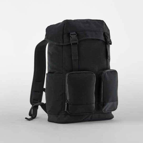Voděodpudivý materiál, držadlo, nastavitelné a polstrované ramenní popruhy, stahovací šňůrka se stuhou, integrovaná bezpečnostní kapsa, vzadu poutko, boční kapsy s magnetickým zapínáním, velké přední přihrádky na zip, velká hlavní přihrádka, polstrovaná přihrádka na notebook vhodná pro notebooky do max. 16″, štítek TearAway, objem 21l, rozměry: 50x33x13cm, pouze čistit houbičkou