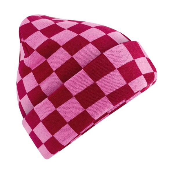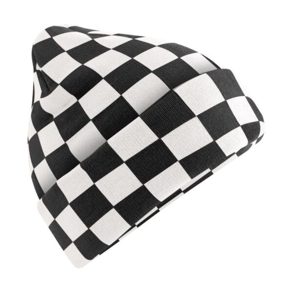 Pletená čepice „Checkerboard“, Šachovnicový vzor, široký lem, dvojitě pletená, jemný žebrový úplet, štítek Tear Away, ruční praní, nelze sušit v sušičce, nelze chemicky čistit